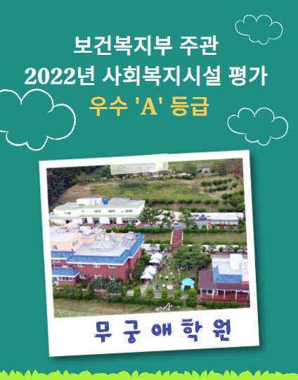 보건복지부 주관 2022년 사회복지시설 평가 우수 ‘A’ 등급 무궁애학원 3년 ago 무궁애학원 2022년 사회복지시설 평가에서 ‘A’ 등급 우수시설로 선정 !! 상위 5% 내의 우수시설로 인센티브 상금 700만원