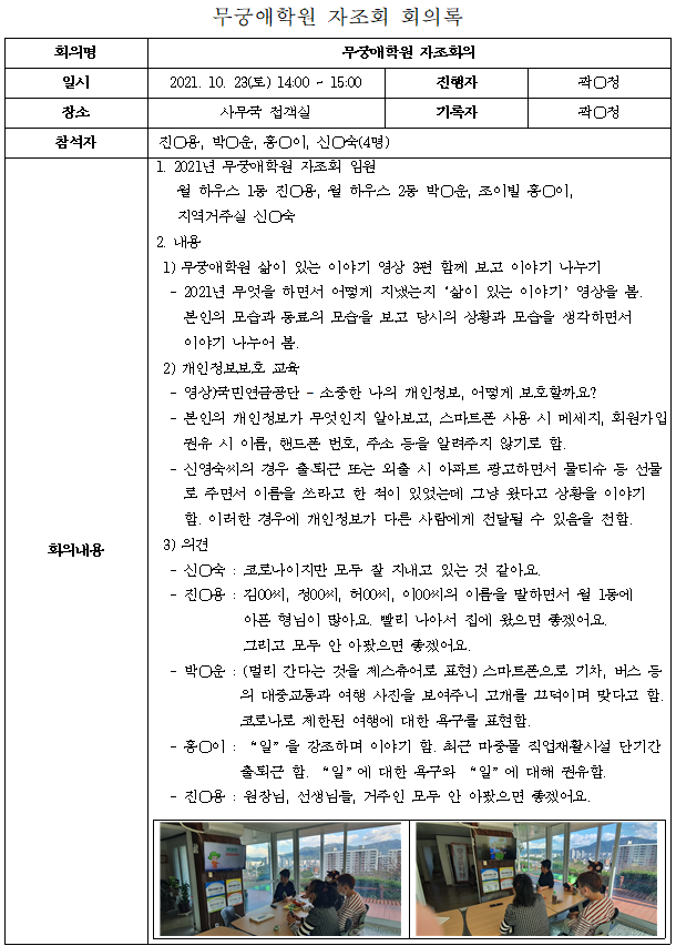 무궁애학원 자조회 회의록 공지 무궁애학원 5년 ago 무궁애학원 각 세대 대표들이 모여 기관운영에 필요한 의견공유 및 불편사항에 대한 의견을 수렴하고자 자조회의가 진행되고 있습니다. 이에 회의록을 공지합니다.
