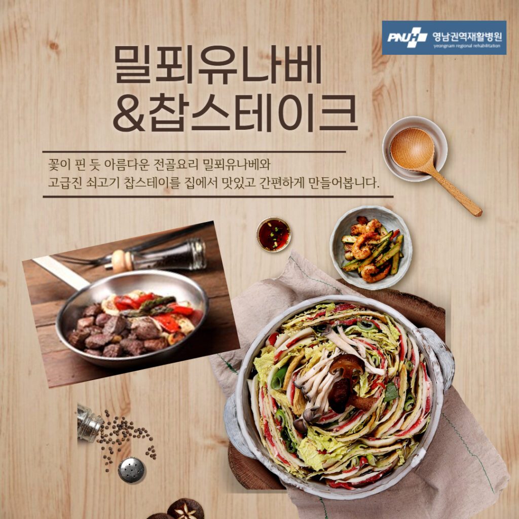 | 2013년부터 영남권역재활병원에서 재활운동을 시작으로 수치료와 여가(영화)생활을 함께해왔습니다. 코로나로 인해 활동이 중단되어 작년에는 체온계와 방역물품, 올해는 밀키트를 후원해주셨습니다. 강동진씨는 혼자 요리하여 멋지게 인증샷도 남겨주셨고, 각 홈마다 밀푀유나베도 예쁘게 만들고, 찹스테이크도 고급지게 요리하여 맛있게 드셨습니다 |