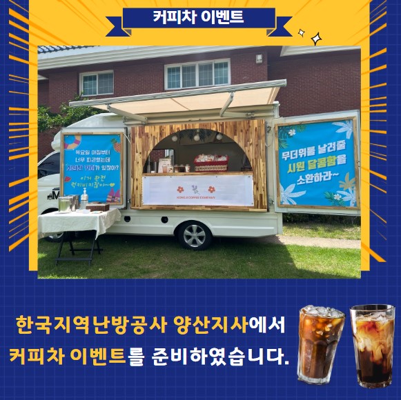 한국지역난방공사 양산지사 커피차 이벤트 무궁애학원 8개월 ago 무궁애학원 후원&자원봉사팀인 한국지역난방공사 양산지사에서 커피차 이벤트를 준비하고 있습니다. 많은 관심과 참여 부탁드립니다.